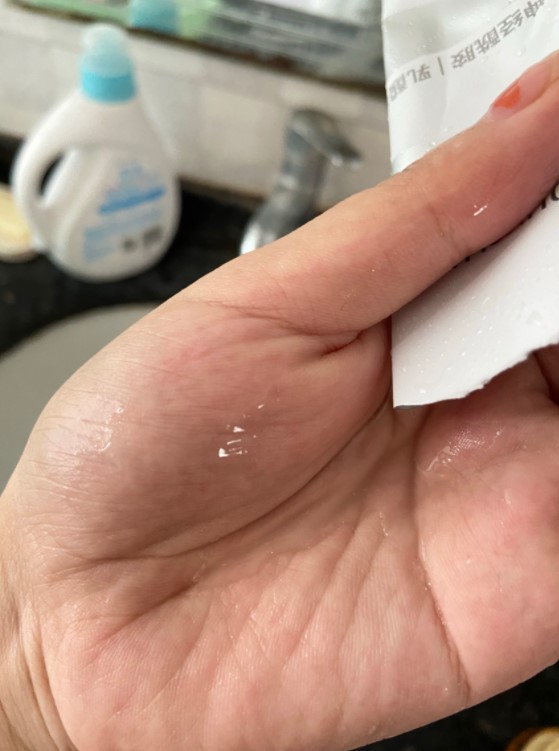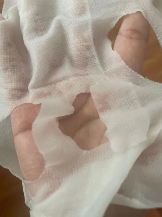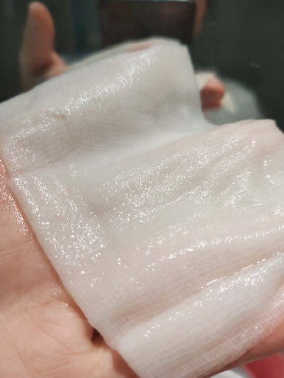 拆开面膜,有股淡淡的纱布味道,里面精华特别多取片后竟然还有这么多精华也是惊艳,面膜纸不大小脸妹子贴上也能平整铺开。
