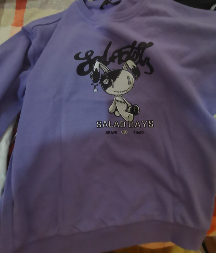 比较宽松的版型,软乎乎的布料,颜色也喜欢,面料材质很软,就收起来了,质量很棒!印花也很棒,有点肥大了喜欢oversize的人可以看看,我的身高体重是165cm。