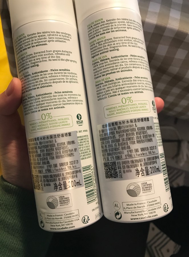 喷雾喷出的水雾化性很好,喷在皮肤上颇有润物细无声的感觉,传说这款喷雾有一种烂葡萄的味道,所以我特意很认真地去闻了一下,真的不觉得是烂葡萄的味道,闻着还不错,香味很淡。