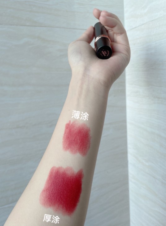 质感是偏向于哑光雾感的,就算是厚涂也不会拔干,薄涂厚涂妆面多变,试了一下 果然是非常少女的颜色,挺上镜的,日常淡妆也可以画色调百搭显白。