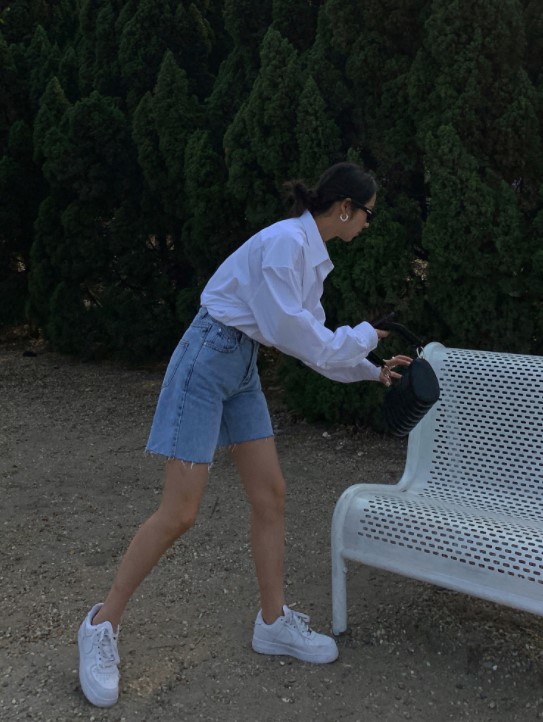 短裤和高帮鞋配一起,容易凸显小腿的,反而低帮的鞋子会显得腿细一点。牛仔短裤配低帮小白鞋,低帮刚好露出骨感的脚踝,看上去会显得骨感一点,当然啦,脚踝也粗的话,可以穿双袜子修饰一下。