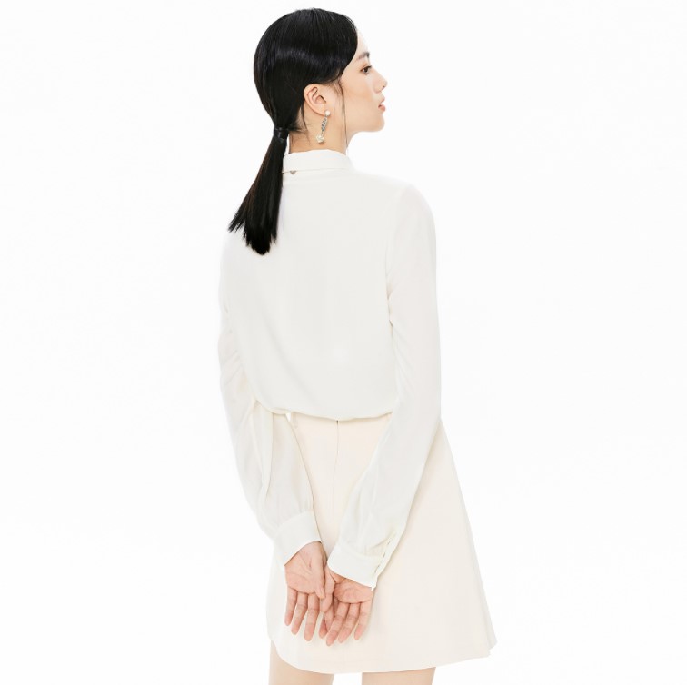 衬衫怎么穿才出彩,奶茶色的娃娃领衬衫,超级的甜美感,在衬衫袖口上加入灯笼袖设计,使得衬衫变得不那么单调,很有文艺又小清新调,下半身搭配灰色的半身裙,显瘦又衬得很神秘。将衬衫束进裙子里,穿出高腰的身材。这种搭配是这6种搭配中,是今秋很流行的5种搭配方式中最甜美的一款哦。