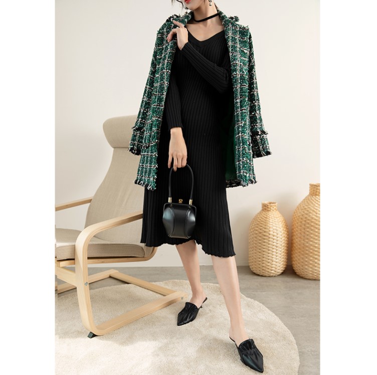 绿色毛呢外套+黑色打底衫+白色小脚裤。白色小脚裤是一款很洋气的裤子,穿出来很显干净,搭配一件黑色打底衫,再搭配一件绿色毛呢外套,时尚、大方又很显气质。