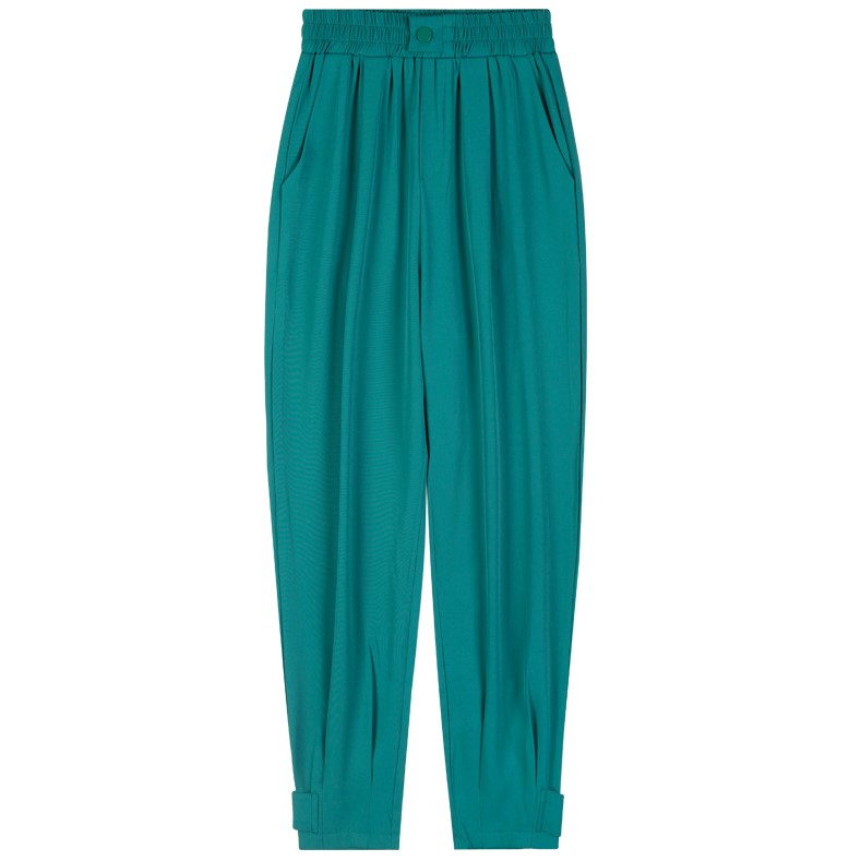 1、大腿粗、小腿瘦的人,哈伦裤拉低了中心,容易使腿看起来偏短,所以它比较适合用来作遮大腿显小腿的造型,那宽大的胯部能更好的遮掩肥硕的大腿,小腿处的收紧更能起到很好的瘦腿效果。