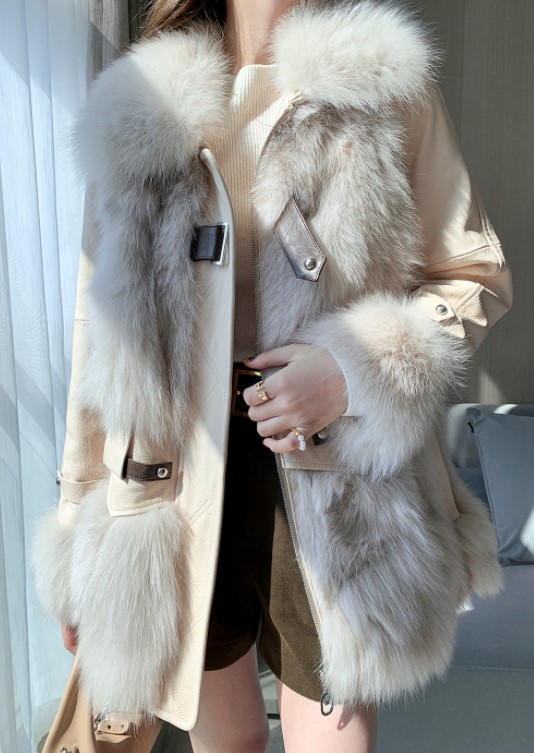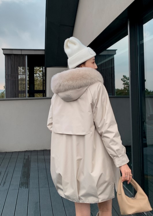 2、其次看是不是整皮,整皮当然最显档次也最贵了,拼的也行,毛针细腻的比粗的保暖显档次,底绒越丰富越好。