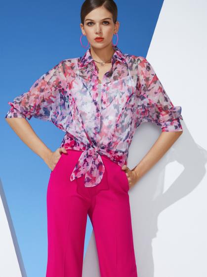 这种扣法我建议大家最好用绸缎面料的衬衫来打造,不会像棉麻质地的衬衫那么硬挺,更能突出身体的曲线美。胸前自然形成的坠落衣摆也很有装饰感,还能在不经意间帮你遮盖腹部的瑕疵。