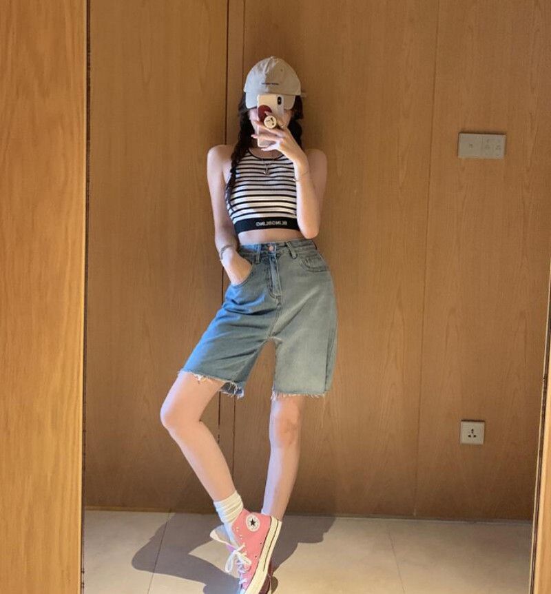 蓝色短裤如果选择碎花或是彩色的上衣,为了让上身颜色的比例减小。可以尝试背心或是将上衣扎进裤子,这样能减小上身的存在感。或者选择更加长的上衣减小裤子的存在感。