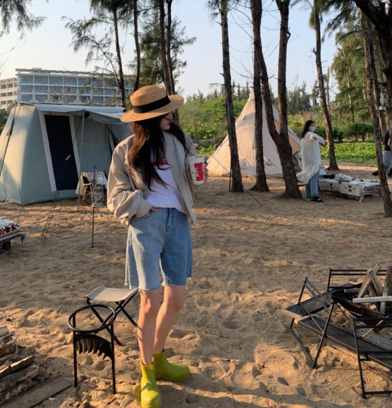 与饱和度不那么高的蓝色短裤搭配,也要选择饱和度或者亮度不那么高的色彩~浅色系的比如白色、蓝色、灰色、粉色、米色等颜色都不失一定程度上的和谐好看。。千万不要和高明度的同色系搭在一起,会显得非常庸俗。