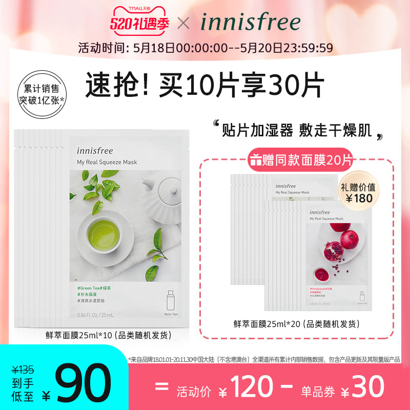 innisfree/悦诗风吟悦享鲜萃绿茶补水保湿面膜10片装 水润精华