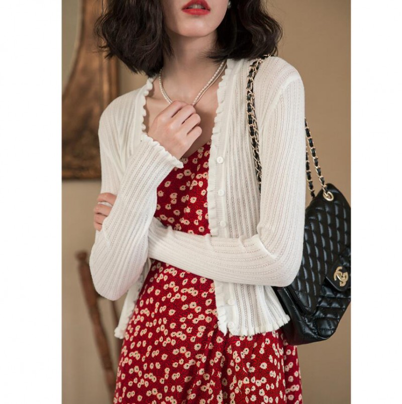 针织衫外套与碎花连衣长裙搭配简直就是一对完美的cp,这样的搭配让人看起来既温柔又轻信,尤其是这种宽松的针织衫外套最能体现出女生娇小的身材,这件浅色的针织衫外套还是很衬肤色的,我们再内搭一件碎花连衣长裙,看起来就满满地田园风