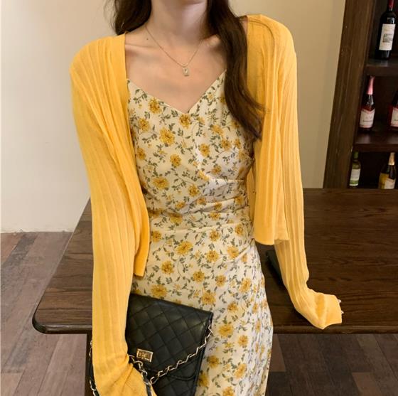 春天碎花裙穿搭:这身穿搭外套是一件温柔的杏色的针织外套,衣服有一点厚底,适合早春,内搭了碎花连衣裙,这件连衣裙给人很温柔和奶的感觉,约会穿这套肯定不会出错,温温柔柔的小姐姐谁不爱。