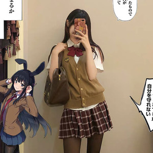 身上的毛衣搭配菱形图案和细细的麻花,海蓝色给人清爽的印象。
