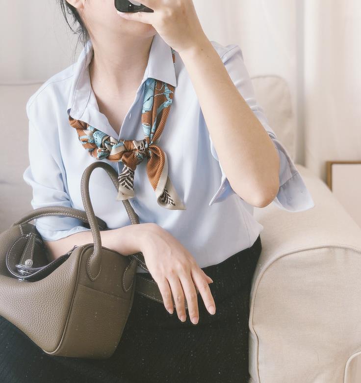另外还有把长丝巾系在脖子正中间的方法,有领带结、平叠扣、蝴蝶结。蝴蝶结更适合温柔可爱的搭配,另外两种是更适合职场通勤的系法,这些造型用撞色或者纯色的丝巾都很好看。领带结的下摆可以放在衬衫里也可以垂在外边,更加帅气,平叠扣的下摆更适合放在外边,比较潇洒随意一些。