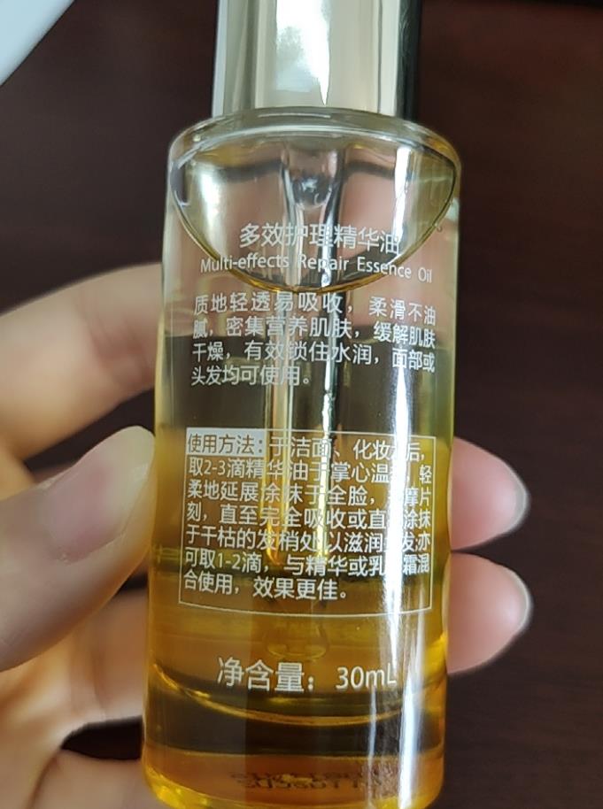 这款精华油既可以护肤又可以护发,多种用法,护肤·修护滋养,锁住水分,舒缓肌肤不适增加肌肤保湿度;护发·顺滑柔亮,改善干枯,一抹抚平毛躁滋润秀发亮泽柔顺。