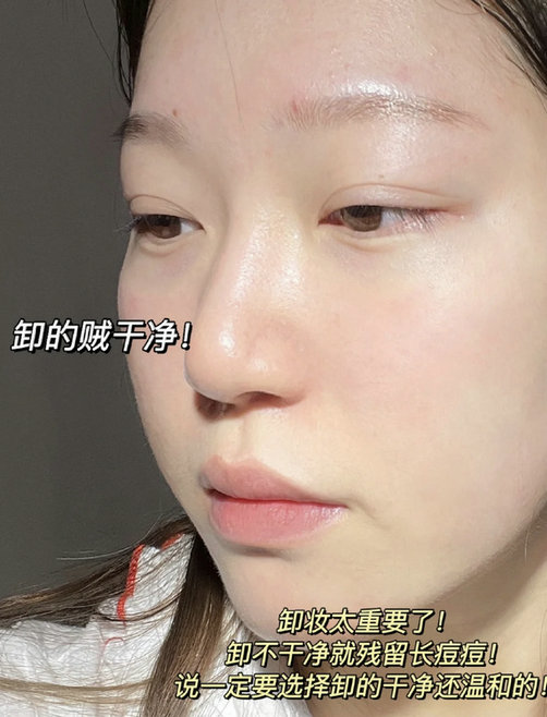 卸脸的时候我还在想会不会刺激皮肤,因为市面上的眼唇卸多少会有微微刺激感,敏感肌是不能用来卸面部的,但我这个担心多余了,隔天脸也没过敏,而且卸的贼干净,也不用乳化不用卸妆棉直接上脸揉就可以!