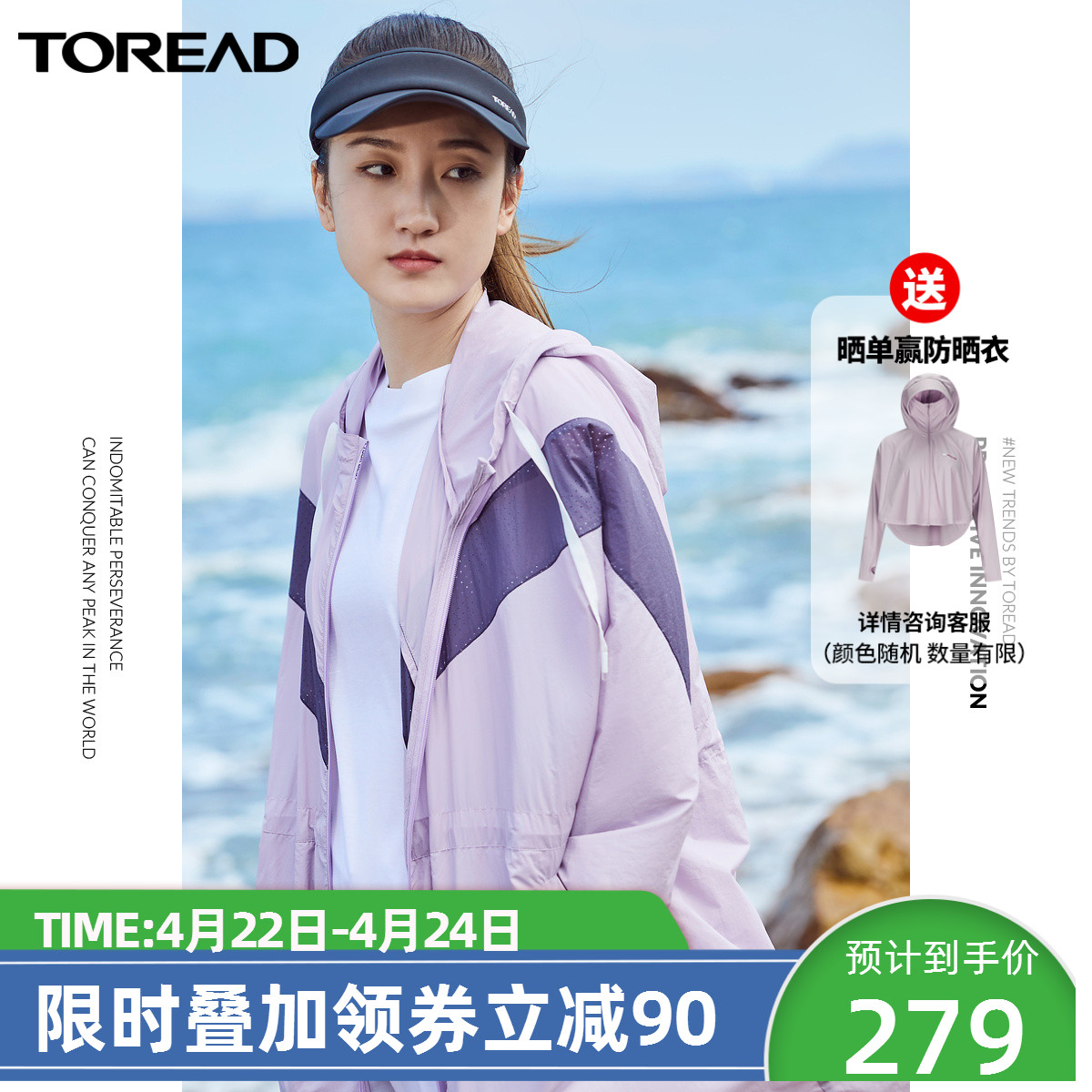 探路者防晒衣女夏中长款防紫外线轻薄透气防风外套拼接连帽皮肤衣
