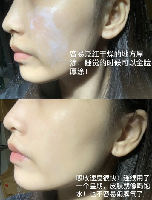拿回家我就试了试,冬天我的脸蛋子几乎全是皮屑,因为实在太干,还红彤彤的,连续抹了几天再去上课,同学都问我为啥不高原红了??hhhhh现在熬夜或者换季都会抹上,谁用谁舒服的肤感。