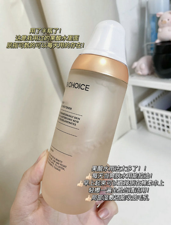 这个果酸真的太温和了,我第一天晚上拿来湿敷,可能是敏感肌的问题,有那么一丢丢痒痒的,但是不像之前用的那些酸类有刺痛感。第二天就没有湿敷,用来当爽肤水拍脸,用完之后很清爽,不紧绷,第二天早上起来我的脸竟然一点都不油了!?