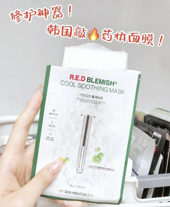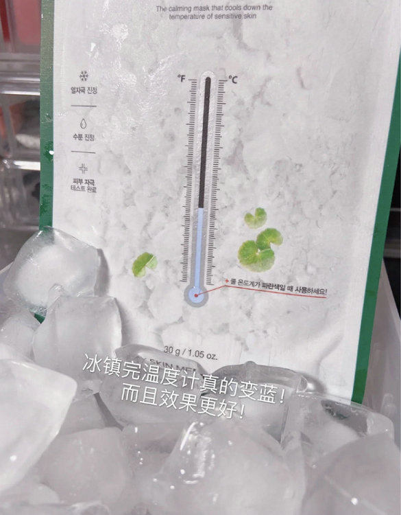 这个面膜有魔术哦~把它放到冰箱里,包装上的温度计会变成蓝色;也是修护神器,含有5种积雪草,改善泛红肌肤,修护舒缓。