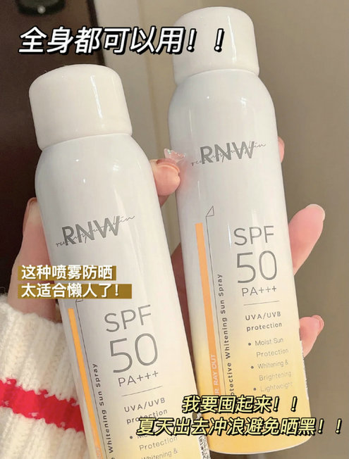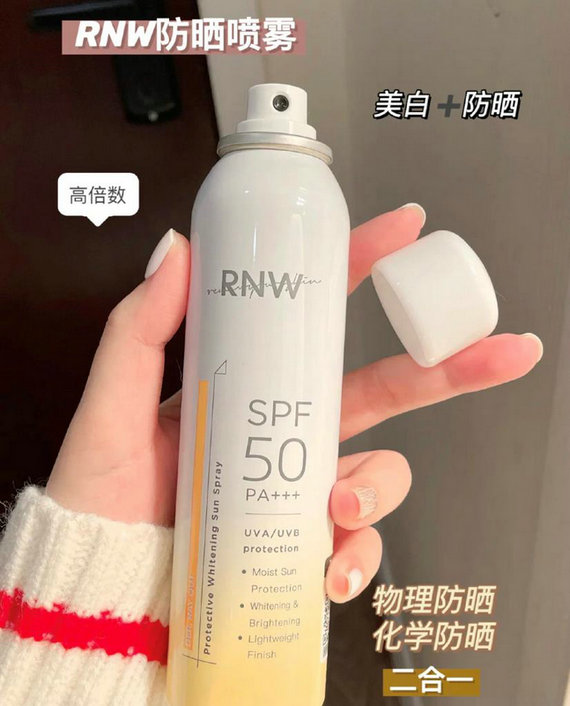 这个RNW防晒喷雾还是我室友安利我的,我和我妈出去玩用的这个,一天都没晒黑,后来我去做了功课,防晒指数SPF50PA+++日常旅游都够,而且喷出来是带“滤镜”效果的,皮肤都是透亮透亮的一举两得了hh=成膜成膜挺快的,不会油光锃亮是哑光感的~