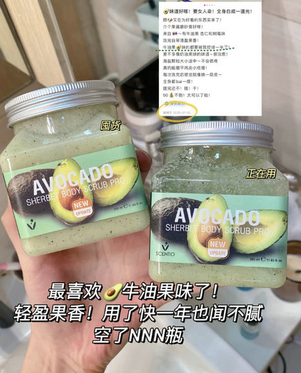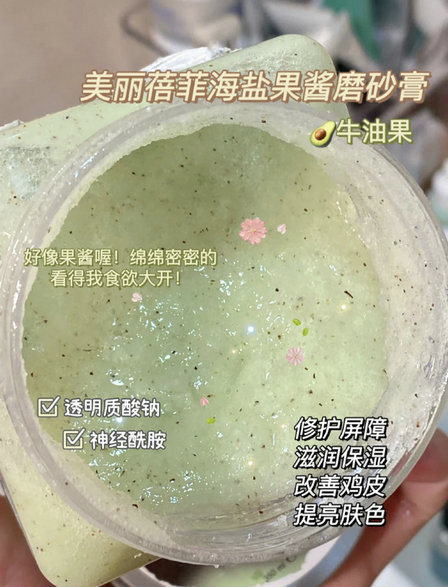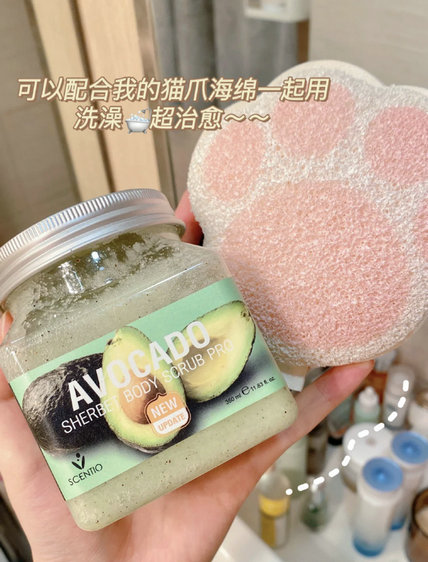 是最最喜欢的牛油果很轻盈的果香清甜不腻,这一大碗像果酱,像沙冰!看到就忍不住想舔一囗,磨砂颗粒是细细的海盐抹皮肤上一点都不疼,它只会带走老废角质不伤皮的稍微按摩下洗掉就OK。感觉毛孔都通透了,大囗呼吸,而且洗完也不用沐浴露也不假滑。