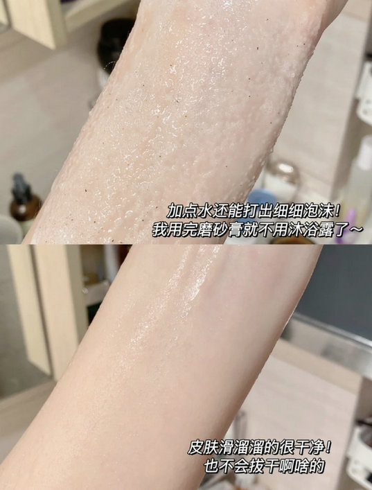 它的颗粒不大,但是又是那种细密的感觉,所以它的清理力很强,适合角质层厚的姐妹。之前角质层比较厚的时候,洗澡时在皮肤上直接涂上轻轻地打圈1-3后冲洗掉很滑,用一次你就会爱上,洗完后会留香很久太适合夏天了~