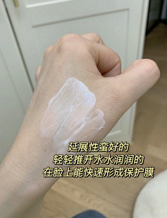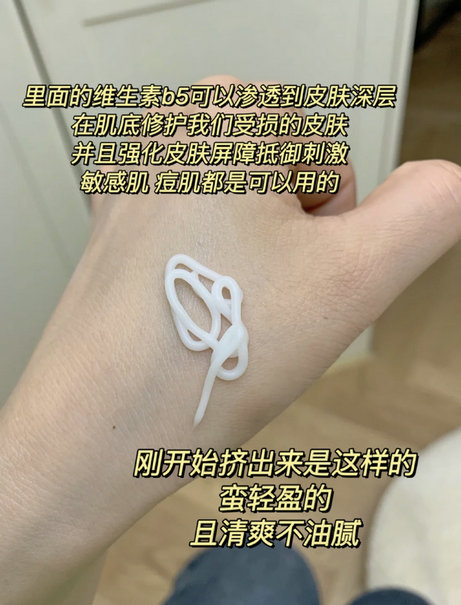 我买的轻盈型,质地轻薄水润且好吸收的那种,里面的维生素B5能深入皮肤肌底,从而去修护我们受损的皮肤,强化皮肤屏障,涂在脸上水水润润,清清凉凉的,很快就在脸上形成了一层保护膜。