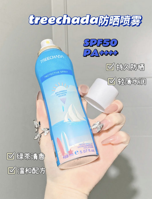 treechada防晒喷雾一款具有美白提亮又有防晒的功能,二合一的防晒再也不需要擦美白身体乳了脸部全身都可以使用哦冰爽超温和,防晒指数SPF50+不油腻的防晒,室内室外都可以使用。