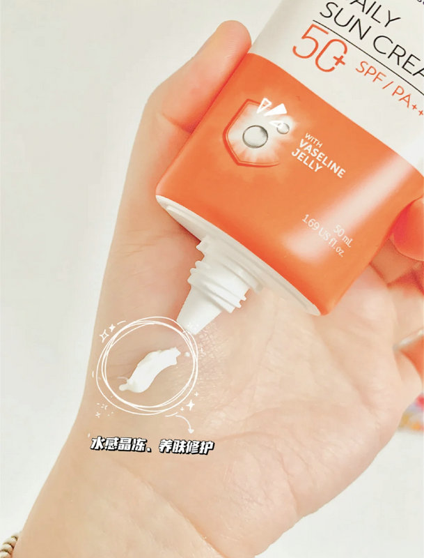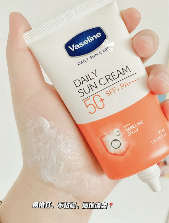首先这款防晒是含有凡士林水感晶冻,除了可以养肤加速晒后肌肤自愈之外,质地还很水润清透,一点也不油腻,瞬间打造水感防晒体验。