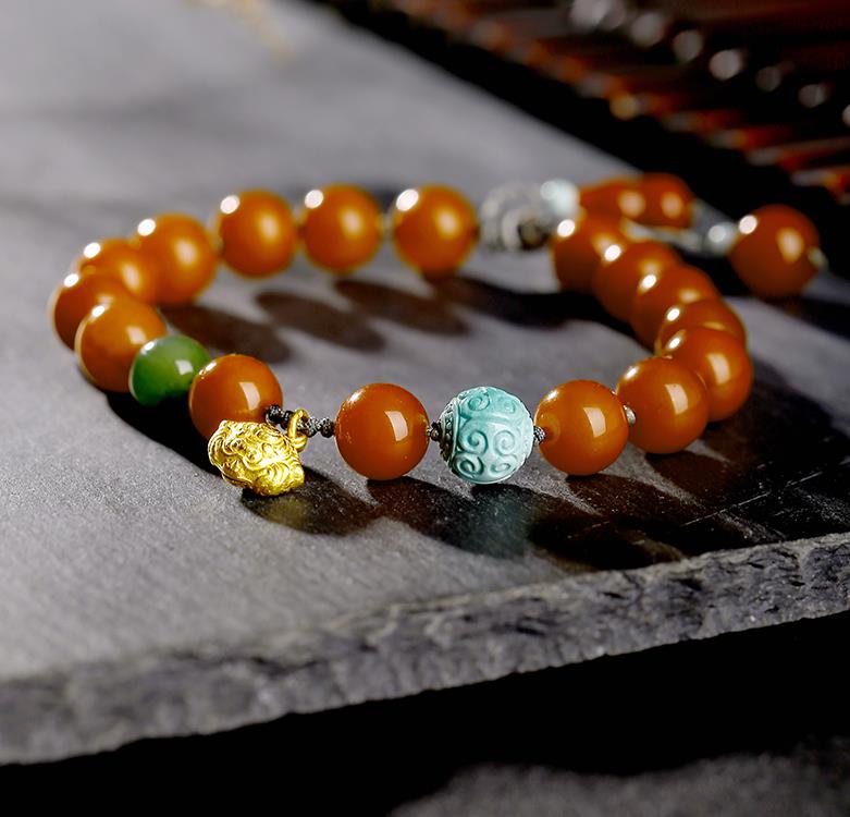 蜜蜡手串本身的色彩主调便是黄色,有一些人在购买的时候难免想稍稍搭配一下,让它不会过于单调,这个时候我们可以选择南红玛瑙原石、青金石、绿松石等等珠子进行搭配,但是建议通常2~3颗就可以了,以免过于花哨。