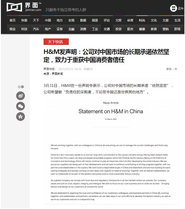 H&M公司3月31日在一份最新声明中宣称,公司对中国市场的长期承诺“依然坚定”,公司希望做“负责任的采购者,不论在中国还是世界其他地方”。值得注意的是,H&M声明全文并未提及新疆,也没有对该公司去年为何发布“我们不与位于新疆的任何服装制造工厂合作,也不从该地区采购产品/原材料”的声明做出解释。