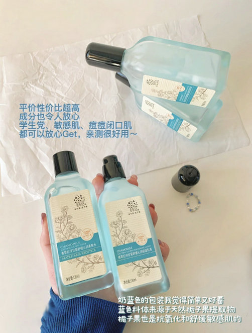 我用的洋甘菊系列的水乳。我的肤质是外油内干的敏感肌。我选护肤品第一是看成分,没有不好的成分添加的我才会选择;其次就是补水要强大,补水不强的话,外油内干的皮肤容易水油不平衡,就容易闷痘长闭口。