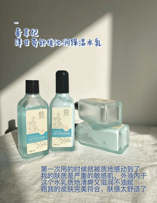 小众出奇迹!真的可以说这款善草纪洋甘菊水乳,是我的肤质的本命水乳了!善草纪我用空了一整套,这阵子又回购了因为觉得真的很适合我的肤质。