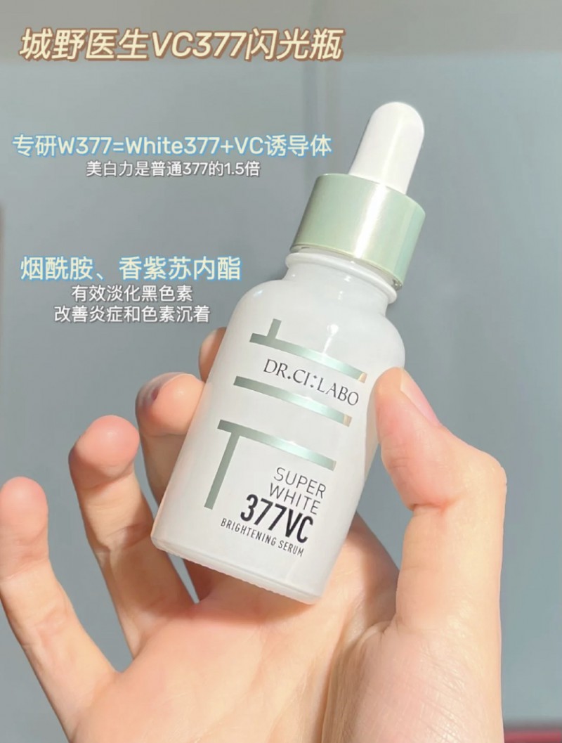 一个是因为这只377闪光瓶的主打成分是城野医生专研W377,是由White377+VC诱导体组成的,美白效果是普通377的15倍!据说它还可以抑制酪氨酸酶生成,从根源处减少黑色素的生成,预防潜在斑点。其次377闪光瓶里还含有大热的美白成分烟酰胺哦!