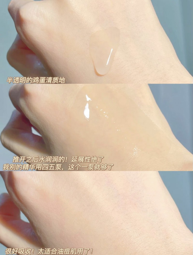 另外我个人感觉它的使用感对油痘皮也非常友好质地轻盈,在皮肤上涂起来水水润润的,非常顺滑轻拍几下就能被皮肤完全吸收,一点也不黏腻厚重,肤感无敌清爽舒适~