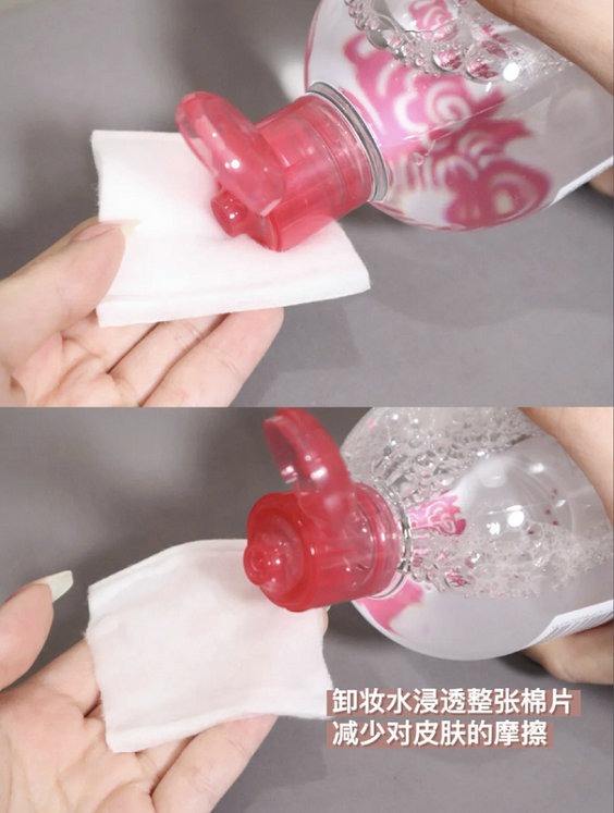 卸妆水到手后分量很足有500ml,使用起来就很耐用。卸妆水是透明的蓝色水状质地,流动性就还挺强的,平时用卸妆棉蘸取使用即可。