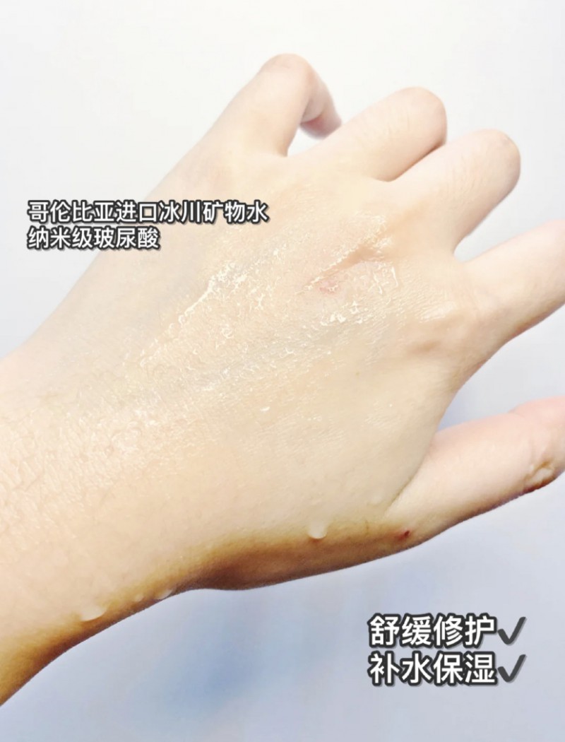 它的成分是产品的一大亮点,添加的哥伦比亚冰川矿物水,含有多种矿物质,能舒缓镇静肌肤,温和不刺激。同时还特别添加水解小分子玻尿酸,比普通玻尿酸在吸收、渗透、补水力上更强,能够深入肌底,密集补水,快速保湿。随时随地能将水分滋润到肌肤角质层,使肌肤纹理饱满,打造水凝光泽,充满透明感的肌肤。