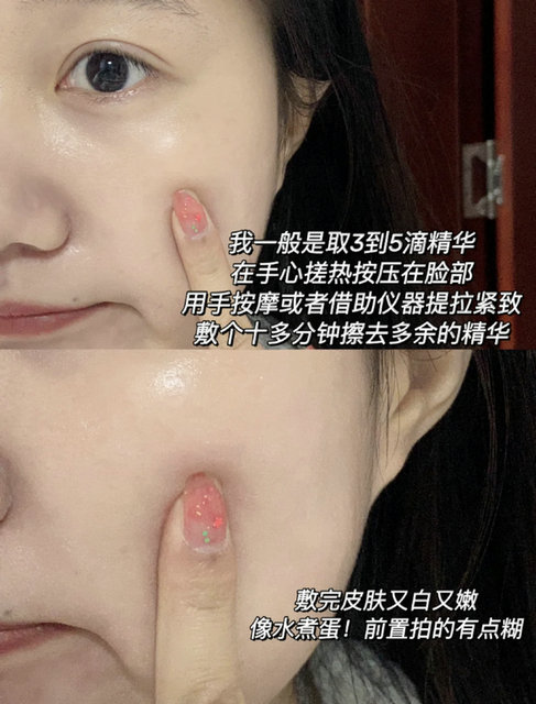 我是直接拿它代替面霜用了,保湿效果很绝,隔天醒来脸摸着都是嫩的,刚开始用的几天,我上粉底也是用它做的打底,很服帖,后续也不浮粉。