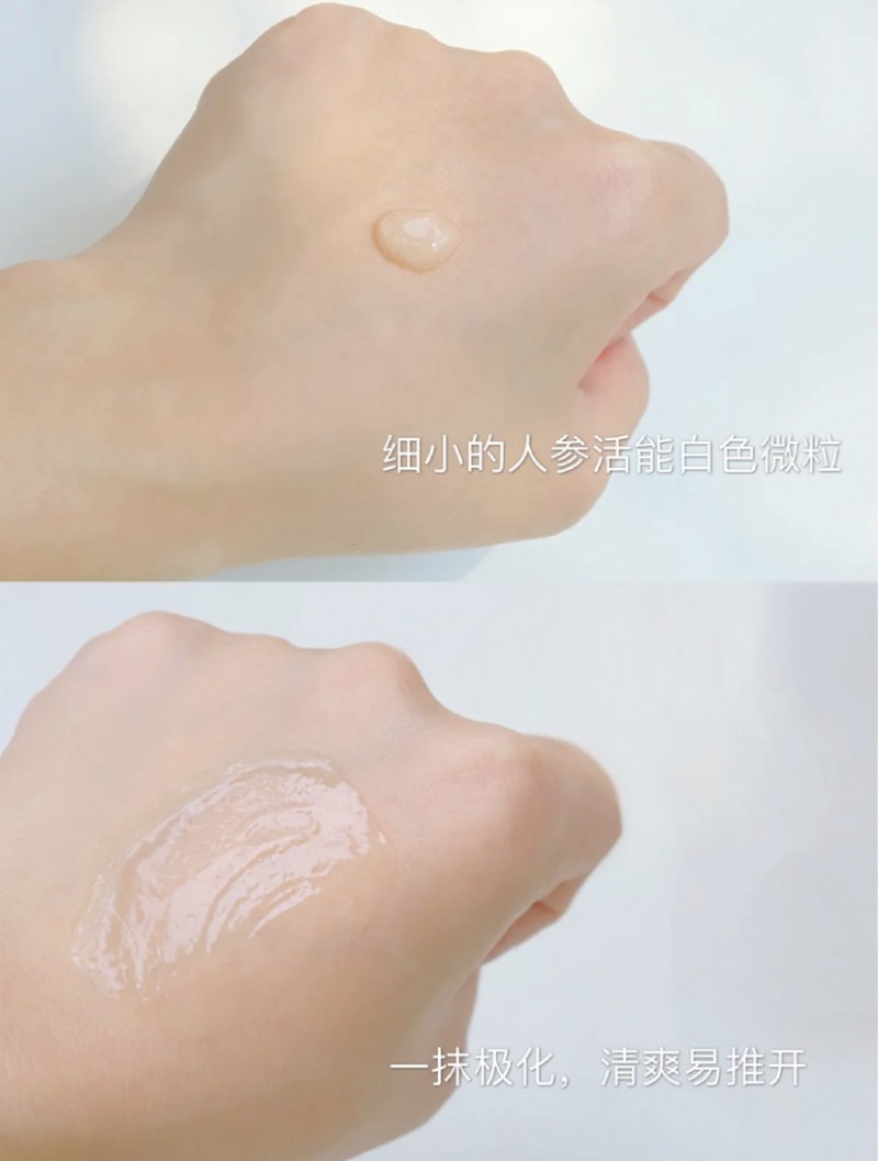 现在到了夏天,我这种混油皮的T区特别容易出油这款精华润而不腻,夏天用也很清爽没有“油田”压力。它的质地是半透明的白色凝露质地非常容易推开,可以看到里面有一些人参活能颗粒,但抹开的时候根本感受不到它的存在,轻轻一抹这些神奇小颗粒按摩一下立马就融化了,超好吸收的!这个精华是淡淡的草本香味,除了靠谱,安心我也找不到别的形容词来分享我闻到它的感受了。