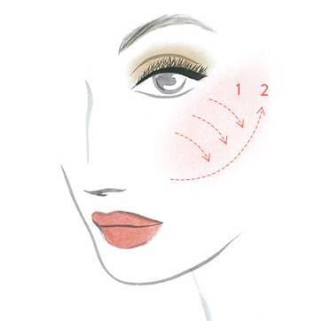 (4)想要让脸型看起来显瘦,可以在脸颊侧画腮红,因为脸颊侧和发际线相连。可以选择颜色较深的腮红,例如砖红色。用腮红刷刷在脸颊外围侧边,多加晕染自然让其融合就好。