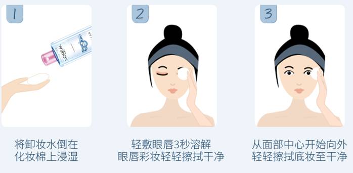 取适量洁颜水浸润化妆棉;用化妆棉擦拭脸以及眼唇彩妆。无须后续冲洗。