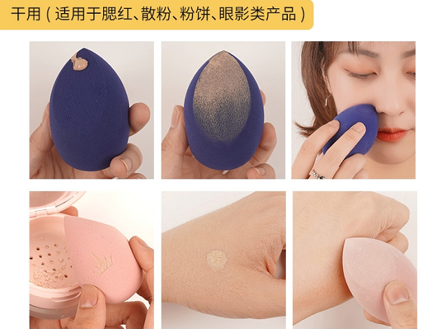 美妆蛋的湿用:将BB霜或粉底液涂在在脸上,再在美妆蛋上沾湿一点化妆水(少量且有湿润的感觉即可),然后再用美妆蛋将BB霜或粉底液按压式散开。