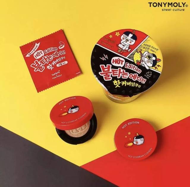 接下啦的这个组合火辣程度直逼周黑鸭组,那就是三养火鸡面和TONYMOLY联名的彩妆系列,。像辣椒油一样的染唇液,像火锅底料一样红火的腮红,泡面桶形象的外包装,随处可见的萌贱小火鸡,都给人带来满满的创意感和欢乐。