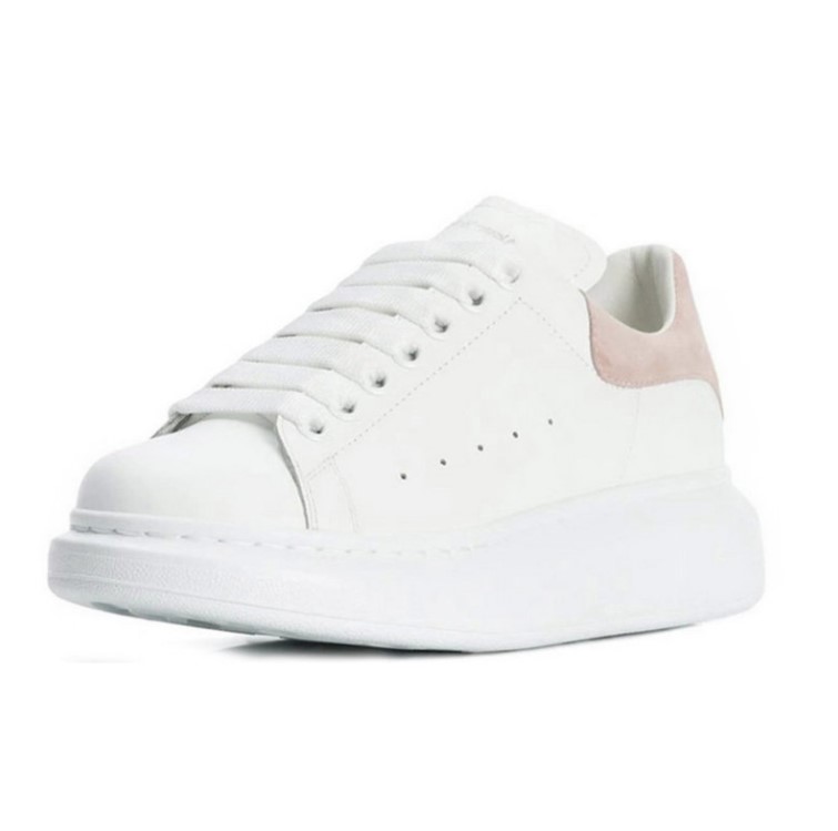 款号553770WHGP79182,材质为牛皮革和羊皮革,麦昆经典小白鞋,这款是白色闪亮牛皮系带运动鞋,采用了圆头设计,鞋跟处点缀了粉色粒纹理,搭配宽松鞋带,后帮有Alexander McQueen品牌标志,这款鞋的售价为3800元。