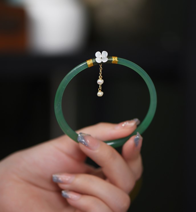叮当镯使用的材质就是翡翠,整体的宽度比较细一些,因为佩戴在一起两个手镯会发出清脆的叮当的声音所以叫做叮当镯,这款镯子的就是细小轻盈很适合女生佩戴。