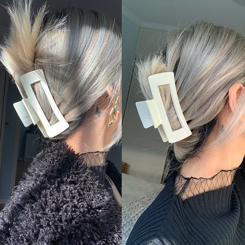 将头发直接撩起、略为松散的夹起来慵懒又好看!其实无须技巧,就像以往夹鲨鱼夹一样就完成了,其实差别就在于,发夹的质感反转了居家印象,拨一点浏海,加一点卷度,反而很有法式优雅气质。