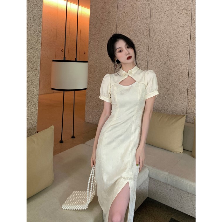 5、简单的刘海,两边的发束自然垂落在两边脸颊,其余头发简单束在脑后,搭配棉麻文艺范的旗袍,十足的小清新。
