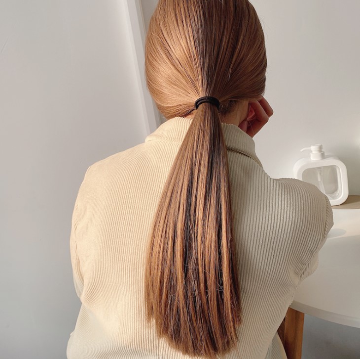 step 2:用橡皮筋将马尾固定住,再轻轻将头顶的头发往上提拉,让蓬松效果更明显。(PS:配上一个简约的发夹或者用好看的发圈也可以,遮盖一下扎发位置的橡皮筋,会更美。
