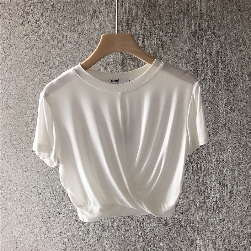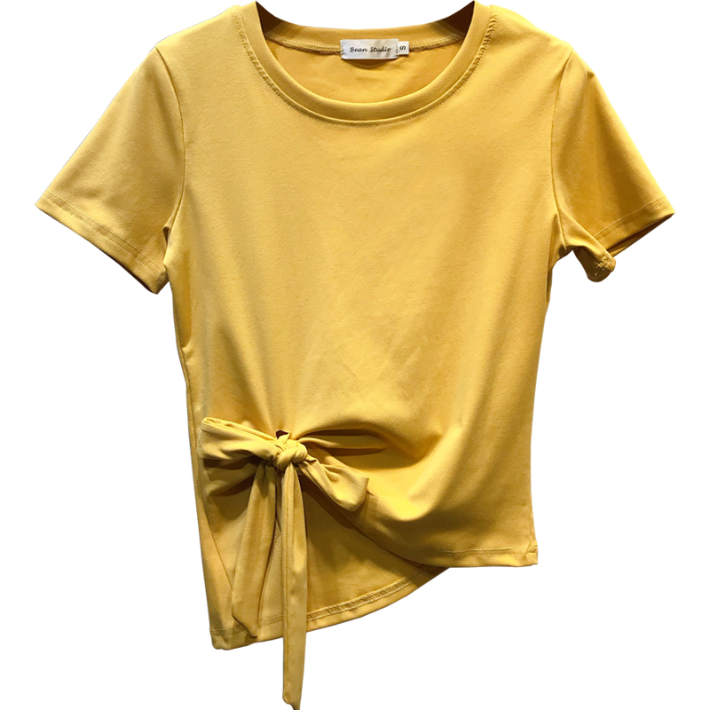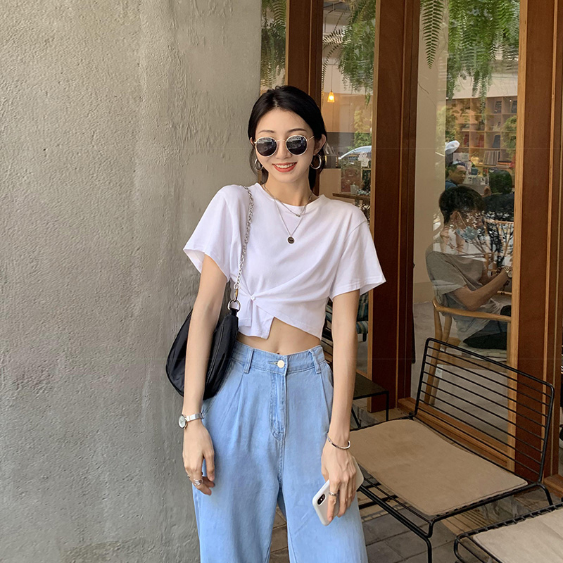 随着这两年crop top单品的流行,下摆打结的T恤也开始盛行。简简单单的扭结装饰,让T恤多了几分时尚感。