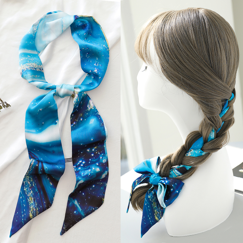 将头发盘起,用发卡固定,蓬松的编发搭配上色彩绚丽的丝巾,就可以将俏皮感和优雅感同时彰显出来。这一款的绑法要注意将“结”绑在下面靠右的地方,露出两根带子,看起来更加柔美一些。